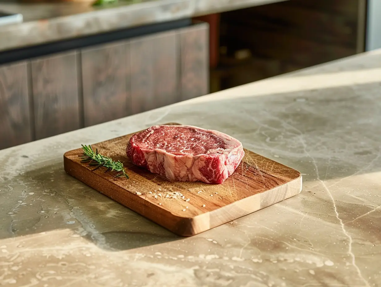 De ribeye staat bekend om zijn uitgebreide marmering - de fijne vetadertjes die door het vlees lopen. Dit vet smelt tijdens het koken, wat bijdraagt aan een sappige en volle smaak.